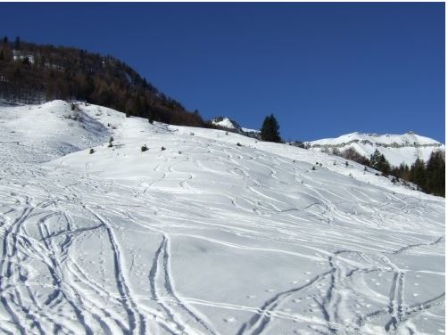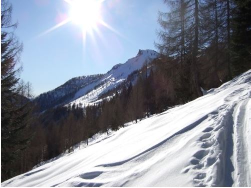 Vom Parkplatz führt eine Forststraße zur Genneralm, die nach 15 Gehmitunten links in einen Waldweg (gelbe Beschilderung) verlassen wird. Der Anstieg duch den Wald ist bei ausreichender Schneelage und Schönwetter ausnahmslos gespurt. Nach einem kurzem Steilstück führt Spur kurzzeitig wieder auf die flachere Forststraße, ehe sie rechts über einen steilen Anstieg in den Wald verschwindet.