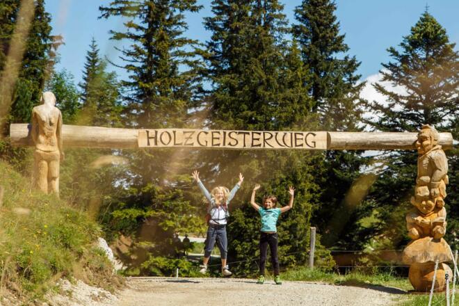 Von der Bergstation geht es auf dem Hauptweg und vorbei am Rauschberghaus direkt zum Eingangstor des Holzgeisterweges, wo Kölli schon auf seine Gäste wartet. Er schickt sie auf einen Rundweg, auf dem sich alles ums Holz dreht. Seit Ewigkeiten schon wird es in und um Ruhpolding abgebaut. Davon zeugen noch viele alte Holzdrifte - so etwas wie Wassertransportwege -, oder das Holzknechtmuseum im Ortsteil Laubau.