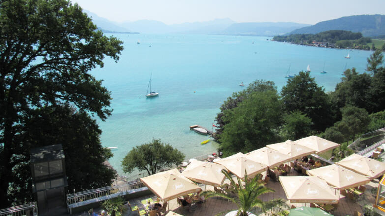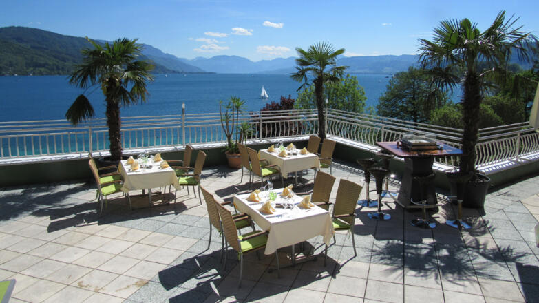 Alle Zimmer und Suiten verfügen über einen Balkon und sind seeseitig ausgerichtet. Einzigartig der Blick über den See auf das gegenüber liegende Ufer welches von der hügeligen Waldlandschaft in das weiter südlich liegende Höllengebirge und den Schafberg schweift.