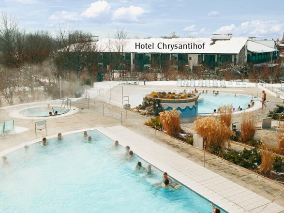 An der Quelle: via Bademantelgang vom Hotel Chrysantihof direkt in die Rottal Terme Hier, mitten im idyllischen Bad Birnbach, liegt in einer Ruhe ausstrahlenden Parkanlage das **** Wellnesshotel Chrysantihof. Es überzeugt mit einer großen Palette für den gesundheitsorientierten und sportlich aktiven Gast. Abwechslungsreiches Sportprogramm, vielfältiges Beautyangebot, breites medizinisches Angebot und Wohlfühlbehandlungen sowie eine große Vielfalt an internationaler Küche und bayerischen Schmankerln, gezaubert aus heimischen Produkten, gehören zum Repertoire des Chrysantihofs. Mit unserem straßentauglichem Golfcart erreichen Sie direkt den Bella Vista Golfpark und können sofort abschlagen.