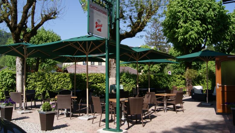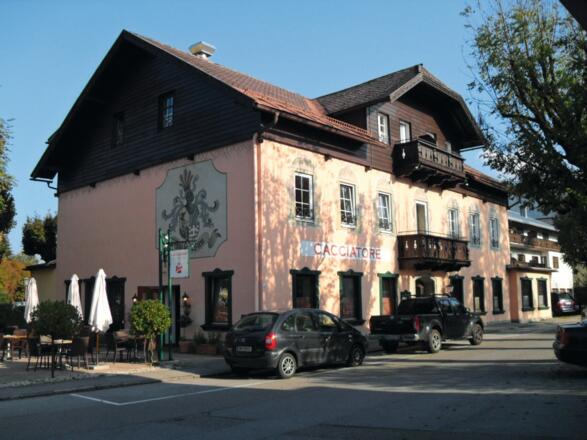 direkt in Strobl an der Ischler Straße, im Erdgeschoß befindet sich die Pizzeria Cacciatore.