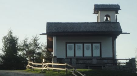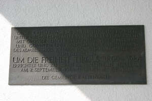 "Diese Kapelle wurde in Gemeinschaftsarbeit unter Mitwirkung aller Vereine u. Körperschaften mit grosser Unterstützung von Freunden und Gönnern und freundlicher Genehmigung des Almbesitzers Johann Fischler im Sommer 1984 zum Gedenken um die Freiheit Tirols 1809-1984 errichtet und zu Ehren des Heiligen Hubertus am 2. September 1984 feierlich eingeweiht.