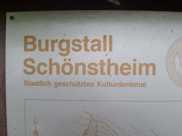 Wieder zurück auf dem Waldweg geht es weiter nordöstlich. An einer Weggabelung scharf rechts halten, wir erreichen eine wunderschöne Lichtung. Jetzt ist es nicht mehr weit zum „Burgstall“ – die Grundmauern einer Anlage, die im Bauernkrieg zerstört wurde. Obwohl nur noch Schuttberge und Gräben im Unterholz vorhanden sind: Ein toller Platz um Räuber zu spielen, hier am „Schönstheim“. Der verlassene Ort lebt übrigens bis heute weiter. Die „Gemeinde ohne Dorf“ wählt noch immer einen eigenen Bürgermeister.