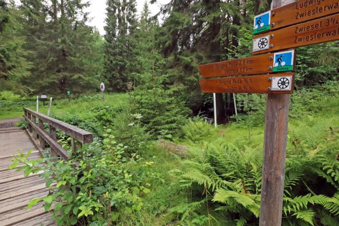 Auf dem teilweise asphaltierten Weg gehen wir nun ca. 2 Kilometer bis zum nördlichen Ortsende von Zwieslerwaldhaus. Dort biegen wir nach rechts in den Pfad mit der Markierung ‚Siebenschläfer‘ ein, der sich bergab durch den Nationalparkwald bis zum Parkplatz Brechhäuslau schlängelt. Am Ende des Parkplatzes biegen wir rechts ab und gehen hinunter bis zur Brücke über die Deffernik und überqueren sie.