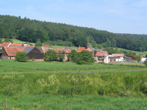 Am Ortseingang halten wir uns links und gehen zunächst mit dem örtlichen Rundweg W 1 und dann mit dem Rundweg 3 am Waldrand entlang. Dieser Wegabschnitt bietet einen herrlichen Ausblick auf die Mainhöhen. Kurz nach Waldeintritt überqueren wir wieder die Straße und kommen zur Waldflur "Heidenschlag".
