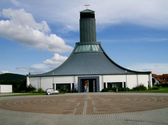 Wir beginnen an der Jakobuskirche und gehen .über den neu gestalteten Marktplatz hoch zum Bahnhof (Information zur Eisenbahngeschichte der «Schiefen Ebene»). An der Evang. Kirche vorbei geht es im Pulstbachtal abwärts nach Himmelkron. Die Stiftskirche (13. Jh., Kloster um 1600 bis zur Säkularisation) und das Stiftskirchenmuseum (bemalte Steinplatten von ca. 1490, u.a. mit Aposteldarstellungen, unter ihnen auch Jakobus d.Ä.) lohnen einen Besuch. Der Weg führt bewusst an der Autobahnkirche St. Christophorus (1998) vorbei. Die Nachbildung des Labyrinths von Chartres auf dem Vorplatz ist ein Pilgerweg im Kleinen. Durch die Siedlung abwärts erreichen wir Lanzendorf und kommen über die Mainbrücke an der St. Gallus-Kirche vorbei nach Kremitz. Auf dem Höhenrücken hinter dem Ort lohnt der Ausblick zurück auf den Frankenwald und den Steilabfall der«Fränkischen Linie», auf die Schiefe Ebene mit Himmelkron und auf die Gipfel des Fichtelgebirges.