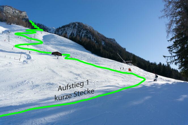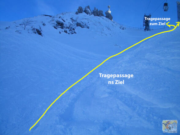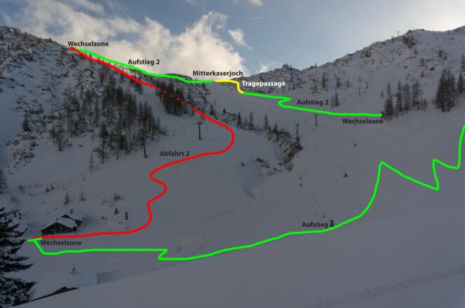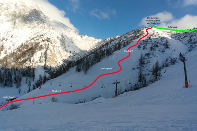 Am rechten Rand der Piste zuletzt in Tragepassage zur Pistenvereinigung an der Mitterkaserschneid. Entlang der Piste zur Bergstation des Mitterkaserlifts (1775 m, 3. Wechselzone)