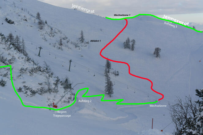 Querung der Skipiste und Aufstieg über den Steilhang (sog. Pulverhang) gegenüber dem Mitterkaser, im oberen Teil wird nach links am Hang entlang zur Piste gequert. Hier am Pistenrand zur Bergstation einer Sesselbahn und einem Rücken (1700 m) folgend zur Wechselzone am Kl. Jenner (1680 m) aufsteigen. Hier auf der Nordseite unterhalb des Jennergrats entlang  in den Gr. Spinnergraben queren und über eine abschließende Tragepassage zur Bergstation der Jennerbahn (Ziel, 1800 m) aufsteigen