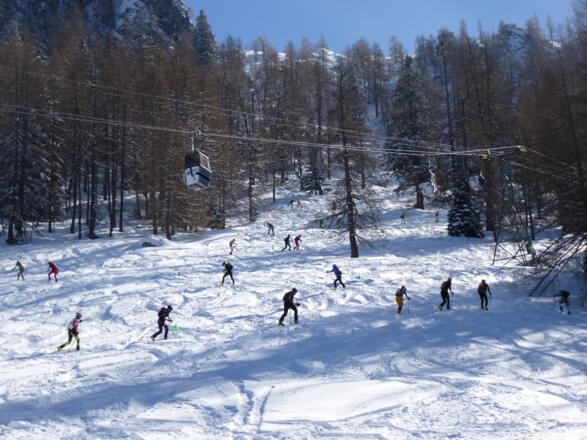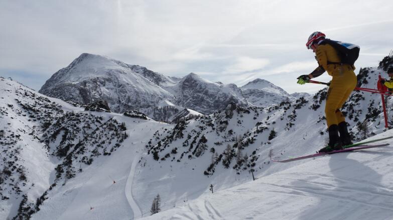 Abfahrt im freien Gelände über die sog. Buckelpiste zum bewirtschafteten "Mitterkaser" (1530 m, Verpflegung, 3. Wechselzone)