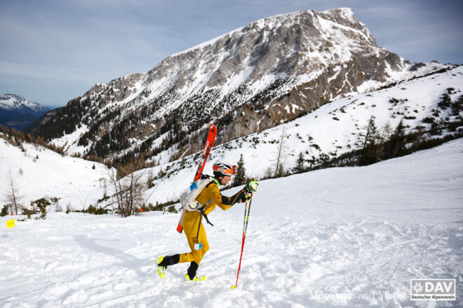 Start für alle Klassen östlich der Mittelstation der Jennerbahn auf ca. 1165 m > kurzes Pistenstück > Aufstieg im freien Gelände des Beckhangs rechts der Piste > Pistenquerung > Aufstieg zum Spinnerkaser (Vogelhüttenalm, 1410 m) und durch den Kleinen Spinnergraben im oberen Teil rechtshaltend unterhalb des Jennergrats entlang in den Gr. Spinnergraben > 1. Tragepassage vorbei an der Bergstation der Jennerbahn (1805 m) zum Jennergipfel (1850 m, 1. Wechselzone)