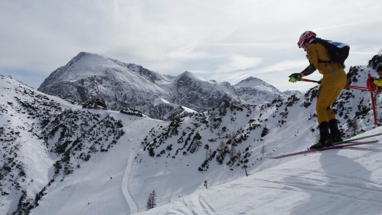 Abfahrt durch den sog. Gr. Spinnergraben zum Spinnerkaser (1410 m, hier Ende der Damenabfahrt) und nach kurzem Pistenstück im freien Skigelände über den sog. Beckhang zur Mittelstation der Jennerbahn (1200 m, 2. Wechselzone).