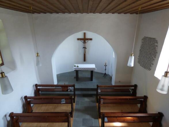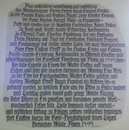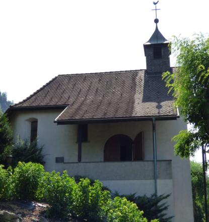 Die 1595 errichtete Kapelle war ursprünglich eine Marienkapelle. Die Stiege zur Holzempore ist aus dem 16. Jhdt. erhalten. Diözesanwappen erinnern daran, dass früher die Bistumsgrenze zwischen Konstanz und Chur durch Hohenems verlief. Das Gebäude wurde zuletzt 1975, v. a. durch das Mitwirken der ansässigen Bevölkerung, restauriert.