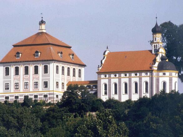 Die im ersten Stock über einen dreiteiligen Arkaden-Gang mit dem Schloss verbundene Schlosskirche ist ein einschiffiger, vornehmer Raum mit reicher Wessobrunner Stuckdekoration und prächtigen Altären (um 1696).