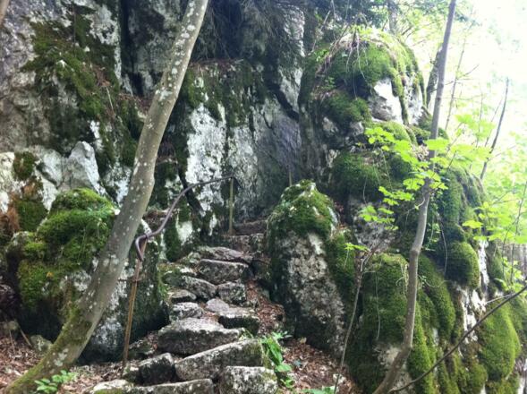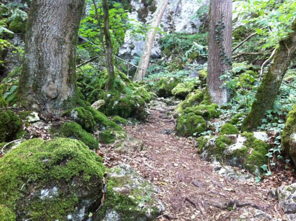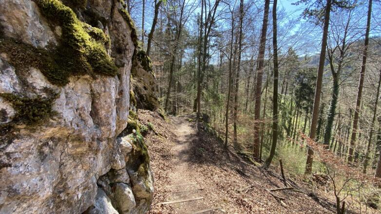 Nach ca. 200 Metern verlassen Sie den Postlkellerweg und folgen der Beschilderung des Jurasteigs bzw. des Altmühltal-Panoramaweges und wandern ca. 3,4 Kilometer durch den farnreichen Wald, bis Sie an der Klamm ankommen. Hier müssen Sie der Treppe bis nach oben folgen. Wer möchte, kann oben einen Abstecher zum Aussichtsfelsen machen und einen ersten Blick auf die gegenüber liegende Burg Prunn genießen.