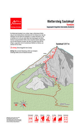 Die Schlüsselstelle befindet sich kurz nach dem Einstieg. Eine leicht überhängende ca. 15 m hohe Wand gilt es zu überwinden. Danach führt das Stahlseil oft senkrecht und luftig bis zum Gipfel des Saulakopfes, 2.516 m. Im oberen Drittel erwartet Sie eine spektakuläre Seilbrücke die auch umgangen werden kann. Mehr Informationen zum Klettersteig selber findest Du im Topo.