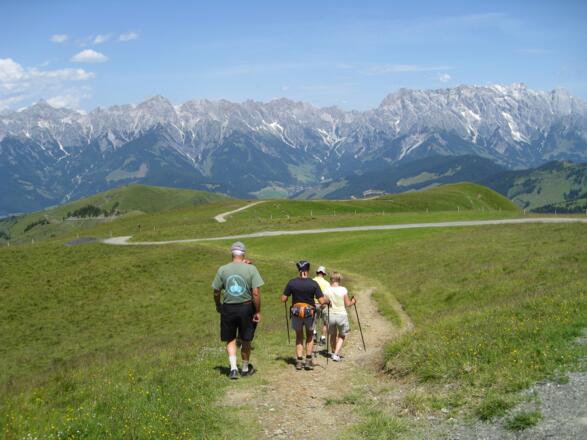 Sie starten beim Tourismusbüro, gehen vorbei am Sporthotel Harlander. Über die Brücke gelangen Sie auf den Spazierweg Nr. 15 und passieren die Mühle mit der Kneippanlage bevor Sie nach ca. 1,5km zur Talstation Karbachalm kommen. Kurz vor der Talstation der Karbachalmbahn zweigt der Weg Nr. 15 links ab. Zuerst als asphaltierter Zufahrtsweg zu einem Bauernhof und später als Wanderpfad führt dieser Weg steiler bergan, hauptsächlich durch Wald bis zur Karbachalm. Nach einer Panoramapause bei der Karbachalm wandern Sie am Weg Nr. 15 an der Bergstation und der Mühlbacher Skihütte vorbei, über sanfte Almböden und schlussendlich durch etwas felsiges Gelände. Nach über 1000 anstrengenden Höhenmetern stehen Sie am höchsten Punkt dieser Etappe, dem Schneeberg mit 1938m. Hier lohnt es sich, eine kurze Rast einzulegen, um das einmalige Bergpanorama so richtig genießen zu können. Nach dem Klausalmkreuz wählen Sie den Weg Nr. 57a zum Sunnhüttl und weiter über den waldfreien Weg Nr. 63 in Richtung Dienten. Vor der Bergstation der Zachhofalmbahn mündet der Weg wieder in den Wanderweg Nr. 15, der am Gipfelkreuz der Wastlhöhe vorbei bis zur Kräuteralm Bürglalm führt. Eine Einkehr und Rast ist auf jeden Fall lohnenswert bevor der Weg Nr. 15 etwas steiler bergab über die Plaudereggalm nach Dienten führt.