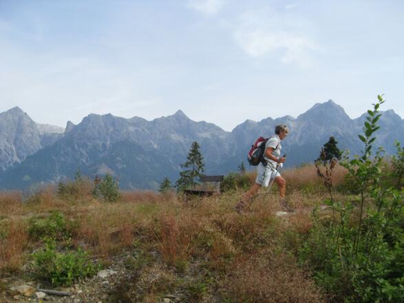 Von der Talstation der Natrunbahn in Maria Alm nehmen Sie den Weitwanderweg 401A über saftige Wiesen zur Bergstation Natrun. Vom Gipfel des Natrun führt Sie der Weg Nr. 26a vorbei an interaktiven Stationen zum Gasthof Jufen mit angeschlossenem Wildgehege. Über Almböden und durch ein kurzes Waldstück geht es leicht bergab zum Pichlhof. Gehen Sie die Hofzufahrt bergab bis zur Bundesstraße und überqueren diese. Etwa 200m laufabwärts der Urslau überqueren Sie eine kleine Brücke, die Sie auf den idyllischen Auweg entlang der Urslau nach Hinterthal führt. Kurz vor der Kirche im Dorfzentrum zweigen Sie rechts auf den Weg 401A zur Mußbachalm ab. Nach einer erholsamen Rast und Stärkung mit Köstlichkeiten dieser Kräuteralm gehen Sie den alten, fast waldfreien Almweg bergauuf bis zur Abzweigung in den ÖAV-Weg 436. Hier genießen Sie noch einmal den herrlichen Ausblick auf das östliche Steinerne Meer. Auf dem Weg Nr. 401A/ 436 wandern Sie über Almwege, Pfade und ein Hochmoor zur Pichlalm. Nach einer kurzen Rast nehmen Sie den Weg Nr. 68 in Richtung Filzensattel. Hier angekommen uberqueren Sie die Hochkönig Bundesstraße, folgen dem kleinen Steig hinauf zur Forststraße (Weg Nr. 50) in Richtung Grünegg - Gabühel. Nach ca. 2km erreichen Sie die Wegabzweigung Nr. 52 nach Dienten von wo aus der Weg bergab übers Gelände führt. Im Tal können Sie hier bereits die ersten Häuser erkennen, bevor Sie der Weg wieder in den Wald und letztendlich auf eine Asphaltstraße führt. Folgen Sie dieser schmalen Straße zur Jausenstation Almhäusl wo der Weg in Richtung Dienten abzweigt. Nach wenigen Metern sehen Sie bereits die Ortseingangstafel von Dienten. Sie passieren in weiterer Folge das Skizentrum, in dem sich auch das Tourismusbüro befindet, und die Blumenhäuser (alte Holzhäuser mit besonderem Blumenschmuck). Von hier erblicken Sie auf einer Anhöhe die Dorfkirche.