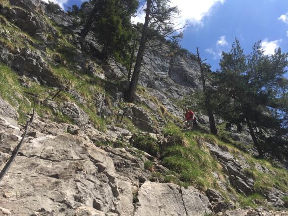 Nach wenigen Minuten beginnen die Sicherungen, welche über die teils ausgesetzten, aber einfachen Schrofen zum Gipfel leiten. Von oben dann schöner Ausblick über den Talkessel von Oberammergau.