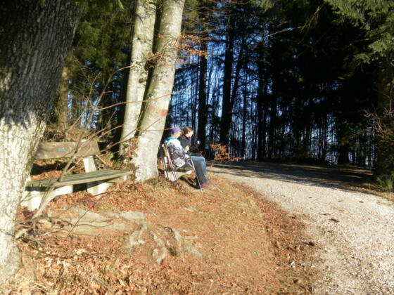 Oberhalb des Leidingerhofs geht es bis zu den letzten Häusern kurz auf der Teerstraße, dann den Wegweisern und rotweißroten Markierungen folgend über eine Almwiese an einem Marienmarterl vorbei zum Waldrand. Ein Karrenweg führt zuerst rechts des Waldkammes, dann kurz flach entlang einer Wieseneinzäunung am Rücken entlang. Hier verlassen wir den Weg nach links und steigen recht steil auf einem Wurzelpfad im dichten Wald bis zu einer Abflachung und folgen nun dem Rücken, bis wir einen Güterweg queren. Ein Rastplatz mit zwei Sitzbänken bietet über eine Almwiese den schönsten Fernblick nach Süd und West.