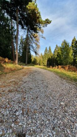 Dein Glück, du biegst nach 150 Meter Bergauf schon rechts auf den Fußweg ab und genießt ab jetzt den Schotter unter deinen Füßen. Auf dem 400 Meter langen Abschnitt geht es leicht Bergauf. Halte dich am Ende der Steigung links in Richtung Almhütte.