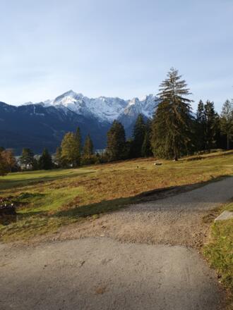 Von nun an zieht dich das Panorama der Zugspitze/Alpspitze/Waxensteine wie von alleine in Richtung Almhütte.