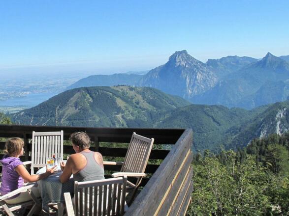 Vom Haus und der Terrasse aus bietet sich ein atemberaubender Rundblick auf den Traunsee mit dem Traunstein, auf das Tote Gebirge bis zum Dachsteinmassiv und über das Alpenvorland bis zum Böhmerwald.