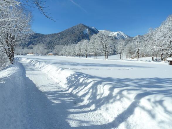 Die sonnige Winterwanderung führt an den Flanken des Hirschbergs über Wiesen und lockeres Siedlungsgebiet bis zum romantischen Abschluss entlang der Weißach.