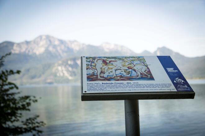 An den insgesamt 8 Stationen des Kunstspaziergangs finden Sie Hinweistafeln, die interessante Informationen zu Franz Marc und seinem künstlerischen Schaffen bereithalten. Die erste Station finden Sie am Bahnhof in Kochel a. See. Von dort führt der Weg hoch zur Kohlleite, einem Aussichtspunkt, der Ihnen einen wunderbaren Panoramablick über Kochel a. See bietet. Anschließend gehen Sie gemütlich zurück in den Ortskern, wo Sie die Gelegenheit haben das historische Fischerviertel und das Grab Franz Marcs zu besichtigen. Auf dem Seeweg spazieren Sie zum Ufer des Kochelsees. Schlendern Sie entlang des Ufers zur Anlegestelle der Kochler Motorschifffahrt (Juni - September). Hier können Sie sich entscheiden, ob Sie noch eine Bootsfahrt auf dem Kochelsee genießen oder sich zurück zum Ausgangspunkt begeben. Eine Bootsfahrt lässt sich übrigens sehr schön mit dem Besuch des Franz Marc Museums verbinden.