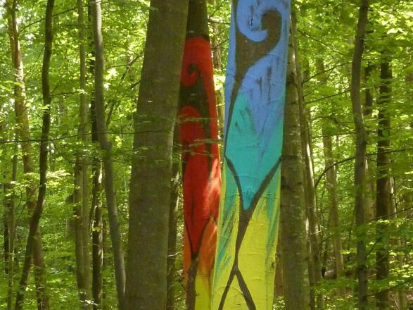 LandArt am Riesrand Die beiden Künstlerinnen Elke Stadlmayr und Karin Bergdolt wollten mit dem Projekt Kunstwald einen Verbindung von Natur und Kunst schaffen und für den Besucher eine neue Erfahrung