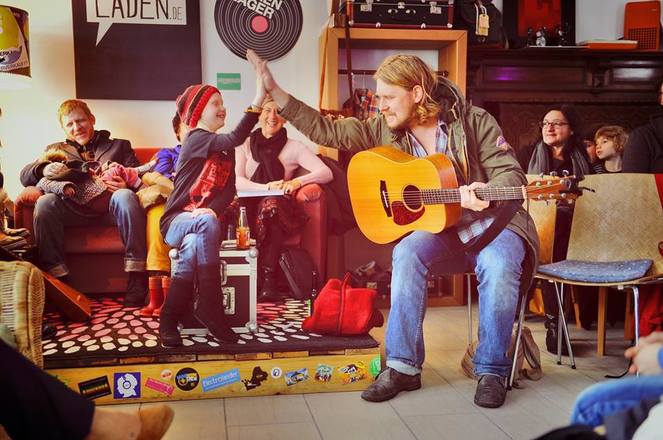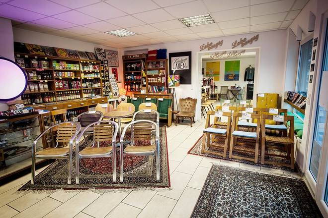 ...bei uns gibt es Bio & Fair gehandelte Kleidung, biologische Getränke und Tee, Bio Feinkost, Stoffe, CDs, Platten, Kassetten und DVDs, einige Bücher, Plattenspieler und vor allem schöne Nachmittage ;-D