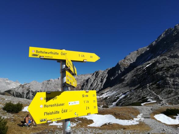 Weiter taleinwärts entland des Fahrweges, oder schöner am Waldsteig, bis zu den Herrenhäusern. Immer weiter dem Fahrweg folgend bis zum Issjöchl am Issanger. Hier steilt es nun noch einmal auf und wir überwinden die nächsten knapp 400hm durch einen grobschottrigen Latschengürtel. Oben angekommen haben wir einen wunderschönen Blick in das Halltal und weit darüber hinaus, sowie Richtung Hallerangerhaus in das Hinterautal.