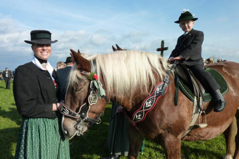 Vorbei an begeisterten Zuschauern zieht der lange Festzug von Murnau nach Froschhausen zur Pferdesegnung. Auch viele kleine und große Reiter sind mit dabei, vom Pony bis zum Kaltblut ist alles vertreten. Eine wahre Augenweide sind die geschmückten Rösser, Kutschen und Wagen und die in traditio-nelle Festtagstracht gekleideten Männer und Frauen.