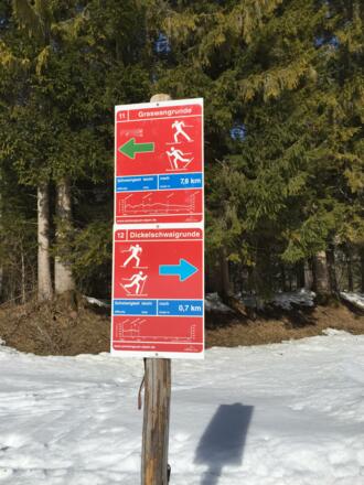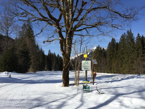 Wanderparkplatz Graswang am Ortsende, Schattenwaldweg. Einstieg in die Loipe eben.