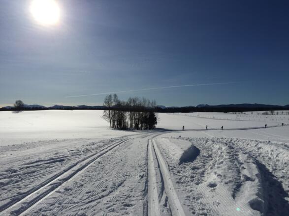 Die sehr beliebte Großhartpenninger Loipe mit herrlicher Landschaft ist auch gut für Langlaufschlittenfahrer geeignet. Die kleine Runde auch für Einsteiger.