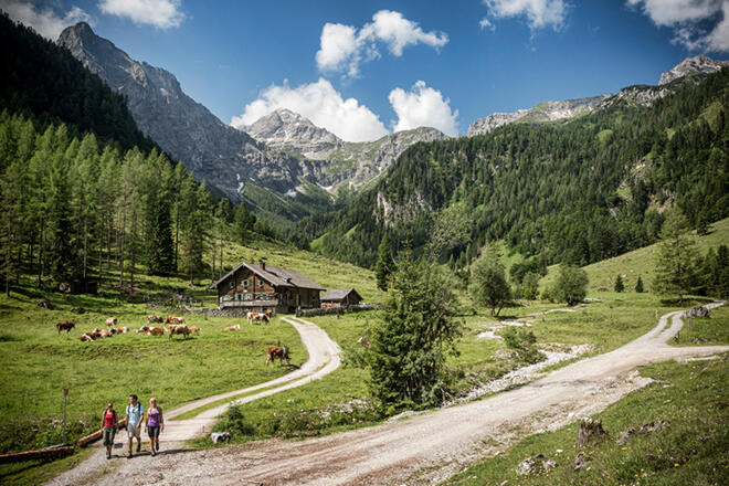 E-Biketour auf dem Ennsradweg ins Almgebiet Marbach in Flachauwinkel. Diese Route führt bis zum Talschluss vor die Gipfel der Radstadter Tauern.