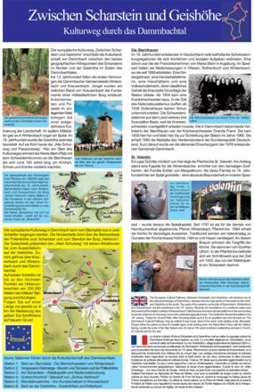 Hier ist auch der Start/Ziel des Europäischen Kulturwanderweges "Zwischen Scharstein und Geißhöhe". Der Maria Stern Platz erinnert mit seinem Schwesternbrunnen an die Sternfrauen, die sich rund 100 Jahre langum die Dammbacher Kirchen, Schule und Kranken verdient gemacht haben. Von hier kann der Kulturweg in zwei Schleifen begangen werden. Die Markierung ist das EU- Schiffchen auf blauem Grund.