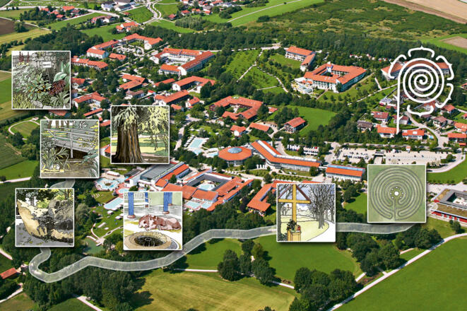 Der Meditationsweg beginnt am Artrium. Der Weg verläuft auf einer etwa 700 Meter langen Strecke. Die einzelnen Stationen sind sanft eingebettet in den Kurpark von Bad Birnbach.