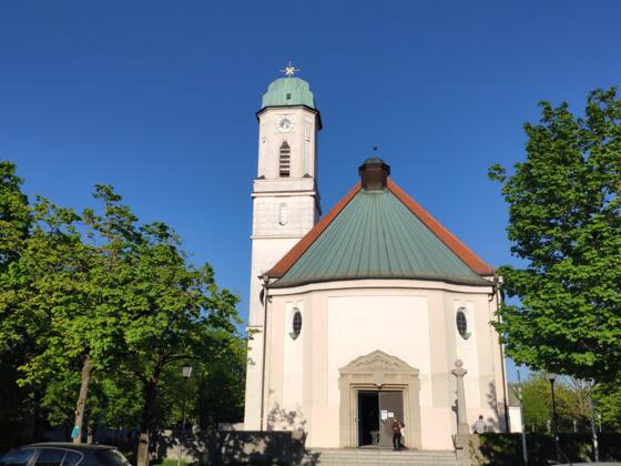 Bevor es zurück zur U-Bahn Olympiazentrum geht, kann noch das Katholische Pfarramt St. Georg München-Milbertshofen besichtigt werden. Die ehemalige Schwaige wurde 1905 auf den Resten einer alten Georgskirche erbaut. Das Neubarock-Gebäude mit Elementen des Heimatstils ist eine Augenweide und ein gelungener Abschluss der Tour.