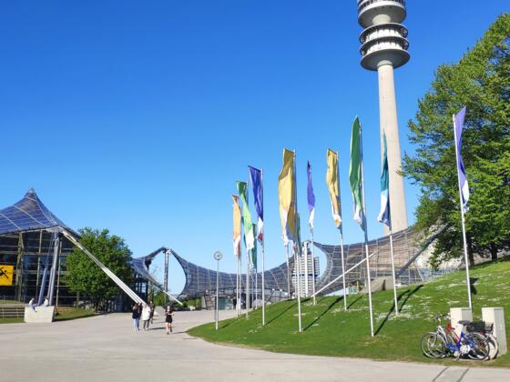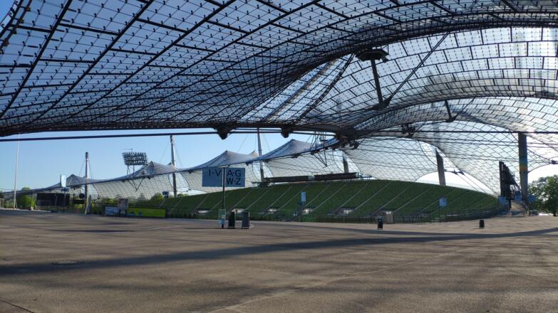Weiter geht es über die westliche Brücke über den Olympiasee hoch zum Olympiastadion. Durch seine markante außergewöhnliche Architektur zählt es auch heute noch zum Herzstück des Olympiaparks. Besonders das Dach aus den geschwungenen Paneelen beeindruckt seit 1972. Das Stadion kann ebenfalls besichtigt werden