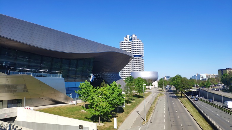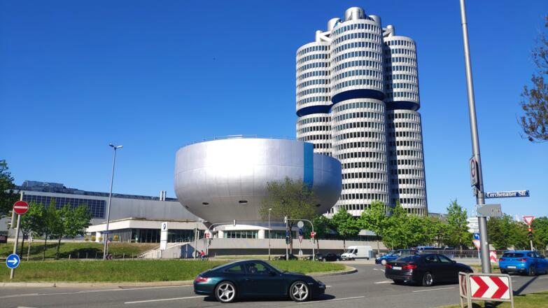 Weiter nördlich kommt man irgendwann an den Frankfurter Ring, den man direkt bei der Ampel überqueren kann. Folgt man auf der anderen Straßenseite dem Weg Richtung Osten erreicht man die ehemaligen Gebäude, in denen die Erfolgsgeschichte von BMW begann. Heute noch zu sehen, das alte Tor der bayerischen Motorenwerke, das Zugang zu einer der 1918 erbauten Werkshallen bietet. Heute kann man in den Gebäuden eine Zeitreise zurück in die Vergangenheit antreten und die ersten Erfolgsmodelle der Marke bestaunen.