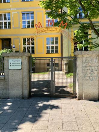Die "Moosacher Volksschule Leipziger Straße 7" wurde 1900 erbaut und um 1924 erweitert. Die rechte Seite der Schule wurde bei einem Luftangriff 1944 zerstört und 1953-1955 wiederaufgebaut.