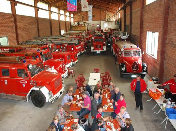 In unserer Halle befinden sich derzeit 34 Großfahrzeuge und 6 Anhänger. Von der Holzleiter bis zur Leiterbühne, vom Tragkraftspritzenanhänger bis zum 3-Achser-Flugplatzlöschfahrzeug, auch Rüstfahrzeuge und Kräne bis 20 t stehen bei uns.