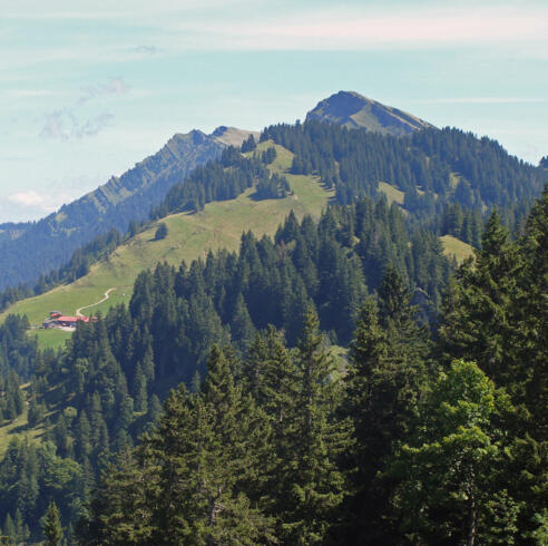 Eindrucksvoll ist auch der Blick nach Osten entlang der Nagelfluhkette. Er führt direkt zum höchsten Punkt, dem Hochgrat (1.834 m). Auf dem Hochhäderich steht man direkt auf der Grenze zwischen Österreich und Deutschland.