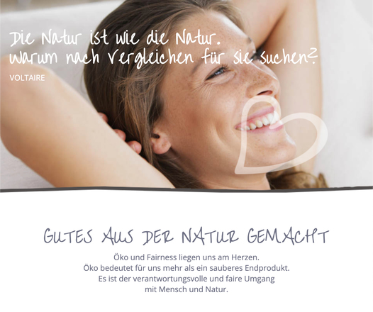 Öko und Fairness liegen uns am Herzen. Öko bedeutet für uns mehr als ein sauberes Endprodukt. Es ist der verantwortungsvolle und faire Umgang mit Mensch und Natur.