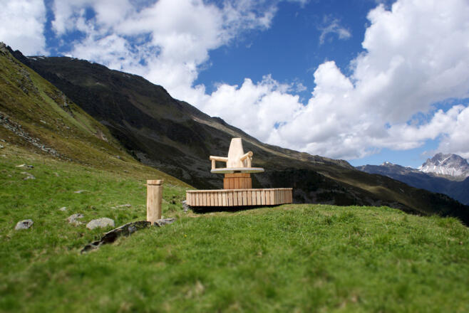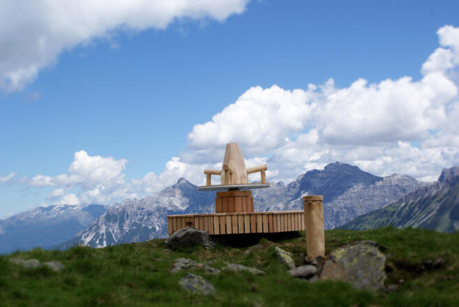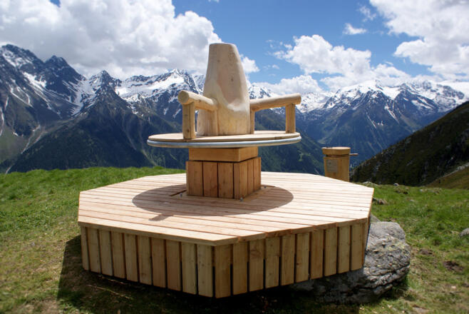 Ein Spielplatz für Mensch und Tier. Knapp unterhalb der imposanten Brennerspitze, auf einer mit Almrosen und Heidelbeersträuchern bewachsenen Ebene, ist der kunstvolle, etwas verspielte Naturschauplatz angelegt worden. Die karussellartige Rastbank ermöglicht es im Sitzen, einen visuell einzigartigen 360 Grad-Panoramablick auf die umliegende Berglandschaft vorzunehmen. An schönen Tagen reicht die Aussicht vom Talboden bis hinaus ins nahe gelegene Inntal und hin zu den Eisriesen der Gletscher am Ende des Stubaitals.