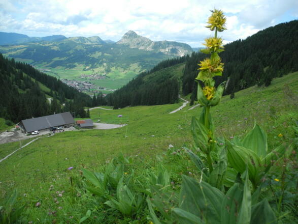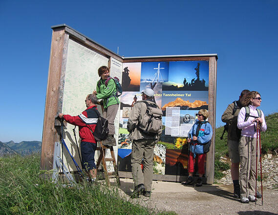 Autofahrt nach Tannheim - Liftparkplatz. Links vor dem Lift gehts hoch zum Wiesenweg nach Schmieden, dann links den Wanderweg hoch bis zur Usseralpe. Aufstieg weiter über die Gundhütte zum Neunerköpfle Gipfel. Wir genießen die herrliche Aussicht und tragen uns im größten Gipfelbuch der Alpen ein. Abstieg zur Gundhütte und nachder Brotzeit mit der Gondelbahn ins Tal. Der Erlebnisweg rund ums Neunerköpfle ist auch für Kinder zu empfehlen, Glockenspiel verschiedene Info Tafeln über Blumen und Tiere.