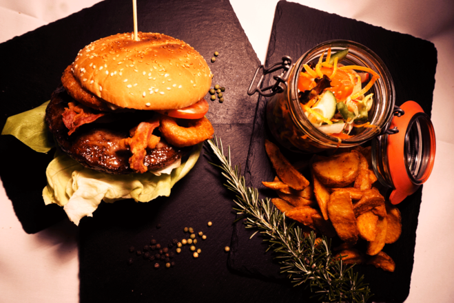 Von leckeren Burgern, über zarten Schweinebraten bis hin zu knackigen Salaten, jeder findet hier etwas, dass ihm schmeckt. Auch leckere Brotzeit wird hier angeboten: beispielsweise hausgemachte Sülze oder reichhaltige Käseplatte.