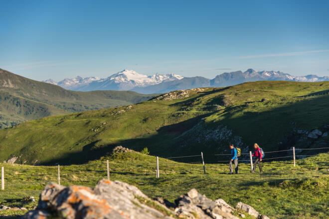 Startpunkt des Nockberge-Trails ist die Talstation Aineck auf der Katschberghöhe. Hier wählst Du den gut ausgebauten Weg Nr. 111 - die sogenannte Autobahn - entlang der Piste auf den Gipfel des Aineck (während der Sommersaison kann auch die Aineckbahn benutzt werden). Spätestens ab hier wird es immer ruhiger: Du verlässt das Skigebiet und wanderst weiter auf dem Weg Nr. 111 über den breiten und aussichtsreifen Höhenkamm nach Süden zum Theuerlnock.