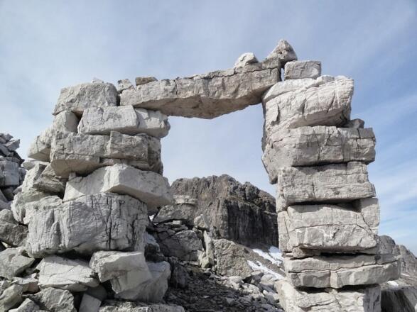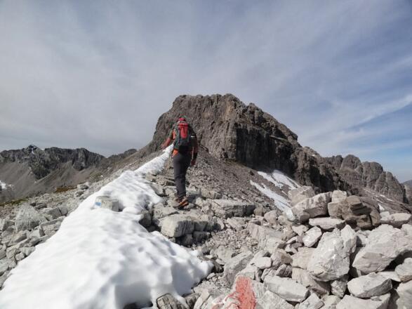 Es sollen hier - kaum sichtbare - Steinmänner den Weg weisen. Ich habe am heutigen Tag an der Scharte keinen Steinmann gefunden. Allerdings ist es ohnehin der einzige Weg nach oben, da davor nur die steilen, meist senkrechten Wände des Johanneskopfes umgangen werden. Die Scharte an sich ist enorm steil und teilweise mit rutschigem Schotter durchsetzt. Das erfordert ausreichend Kraft und Kondition. Oben an der Mulde zwischen den Johannesköpfen angekommen wird man dann tatsächlich von einem Steinmanderl begrüßt. In weiterer Folge sind dann sogar noch einige alte blaue Markierungen sichtbar. Der Weg von der Mulde bis zum Gipfel über den brüchigen Fels ist nicht einfach, aber die Hände wird man nur an ein oder zwei Stellen (maximal I. Grad) kurz brauchen. Ansonsten kommt man dann ohne große Probleme auf den wirklich tollen Gipfel mit fantastischer Aussicht!