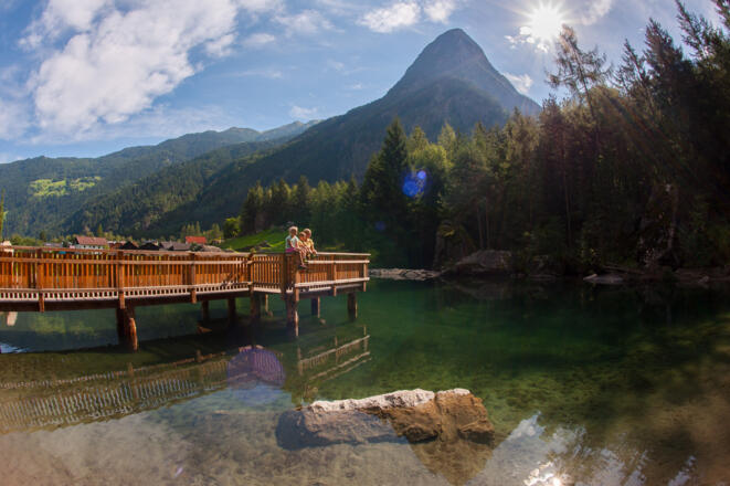 Historische Fassaden-Malereien prägen das Ortsbild im alten Ortskern von Oetz, durch diesen uns die heutige Etappe führt. An den ursprünglichsten Plätzen geht’s dahin. Einer davon ist der ehemalige „Eiskeller“ von Habichen. Nahe des kleinen durch kalten Bergwasser durchströmten See‘s, dem Habicher See, befindet sich diese Felsplatte, worin durch unterirdische Gangsysteme kalte Luft strömt.